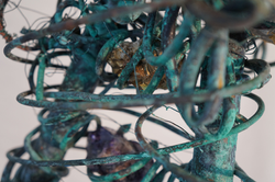 12 ga aluminum wire, 12 ga copper coated aluminum wire, 8 ga copper wire, acrylic paint, azurite with malachite from the Republic of the Congo, concrete, coral collected by the artist in St. Petersburg, FL, hemimorphite from Wenshan, Yunnan Province, China, ink, pyrite with quartz from Brazil, shark tooth from Morocco