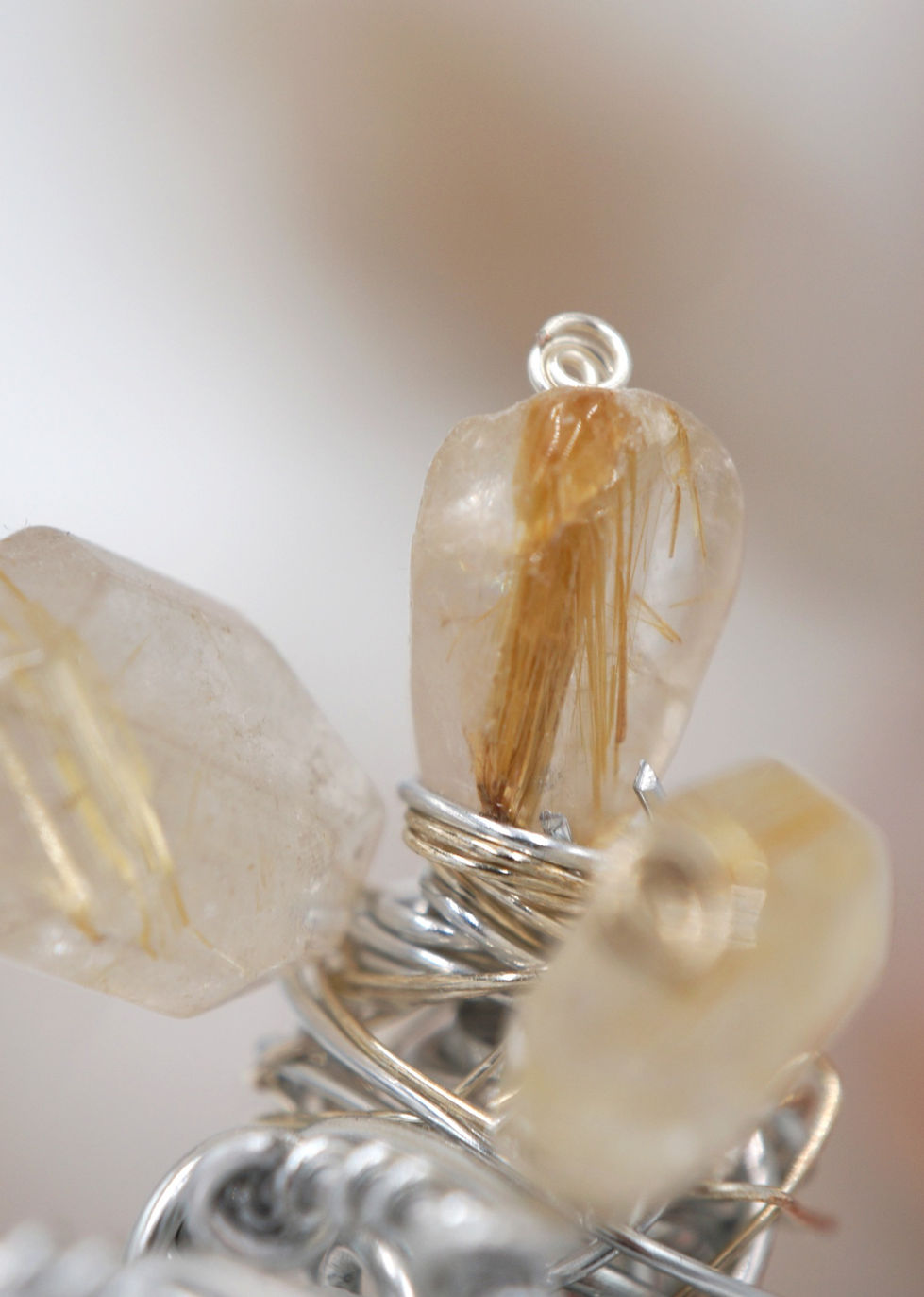crystal, cubic zirconia, Diamantina quartz from Brazil, geode from Morocco, glass, Herkimer Diamond, howlite, dyed white jadeite, pebbles from Arkansas diamond mine, pebbles from Coal Creek sapphire mine in Montana, pyrite from Brazil, pyrite from Spain, quartz, quartz from Brazil, quartz from China, quartz double-terminated from Tibet, quartz from Washington, rutilated quartz, selenite from Morocco