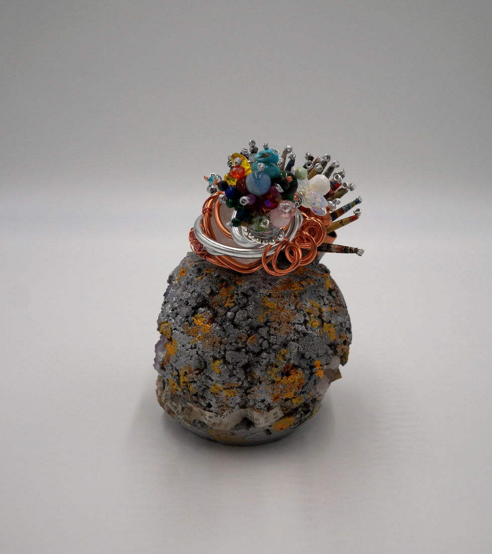 acrylic, acrylic with full spectrum iridescent medium, brass pipe, concrete, copper pipe, newspaper from Brazil dated Saturday the 19th of February, 2011, newspaper from Dongguan, China dated September, 27th, 2017, newspaper from India, newspaper from Morocco, newspaper from Tampa, Florida, United States of America dated Sunday, April 29, 2018, paper