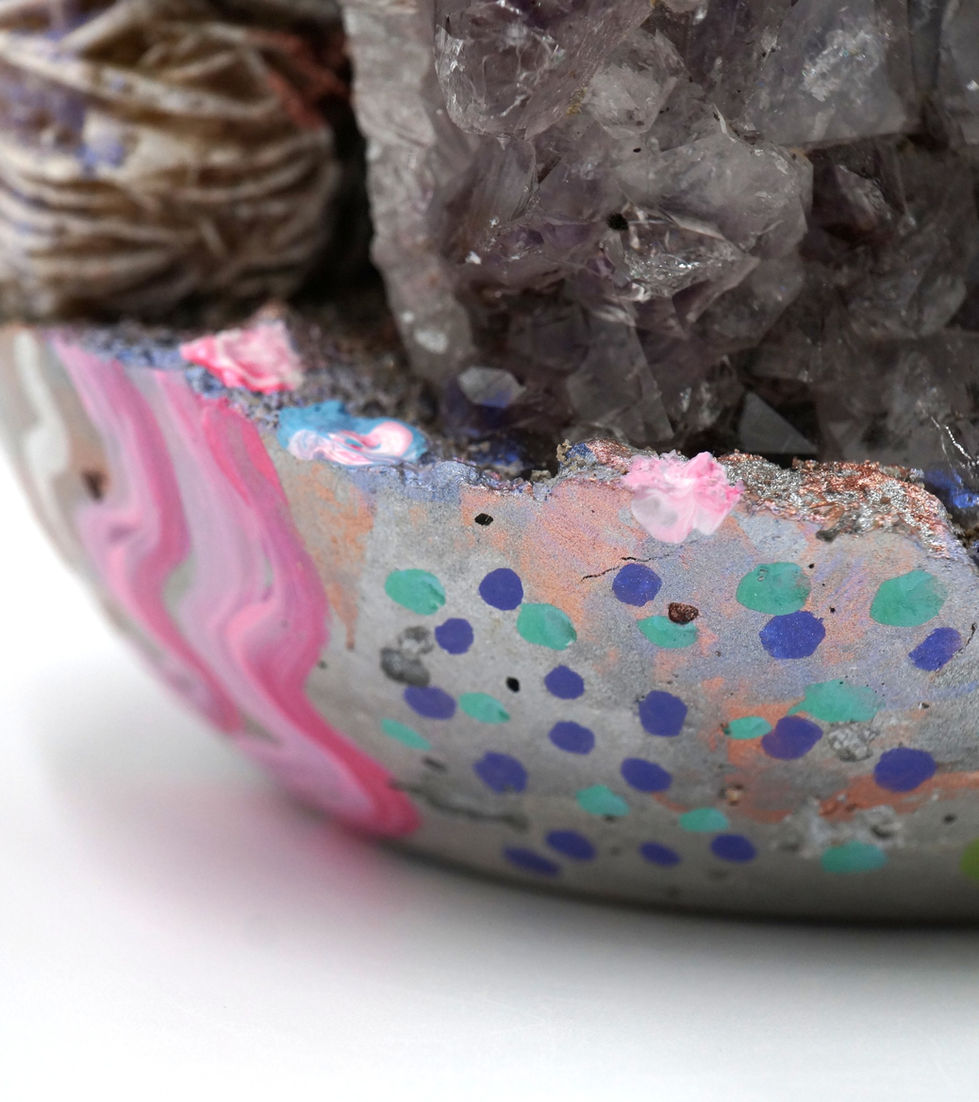 amethyst, amethyst from Brazil, aquamarine, aventurine, blue apatite, citrine, chrysoprase, crystal, cubic zirconia, desert rose from Mexico, dirt, emerald, garnet, geode from Morocco, glass, glass made with ash from Mt. St. Helens, green opal from Australia, fire opal from Mexico, pink opal from Peru, quartz from Arkansas mined by the artist, quartz from Brazil, rutilated quartz, rhodochrosite, rose quartz, ruby from Tanzania, pink tourmaline, vintage glass